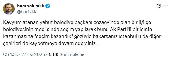 Sosyal medyada duruma tepki gösteren Yakışıklı, “Kayyum atanmış ya da belediye başkanının cezaevinde olduğu bir belediye meclisinde seçim yaparak bunu AK Partili bir ismin kazanmasını ‘seçim zaferi’ olarak görürseniz, İstanbul ve diğer şehirleri de kaybetmeye devam edersiniz” şeklinde ifadeler kullandı.